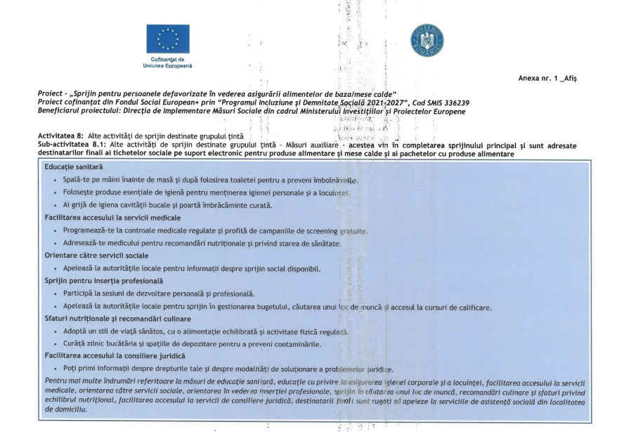 Sprijin pentru persoanele defavorizate în vederea asigurării alimentelor de bază/mese calde CLICK AICI și AICI